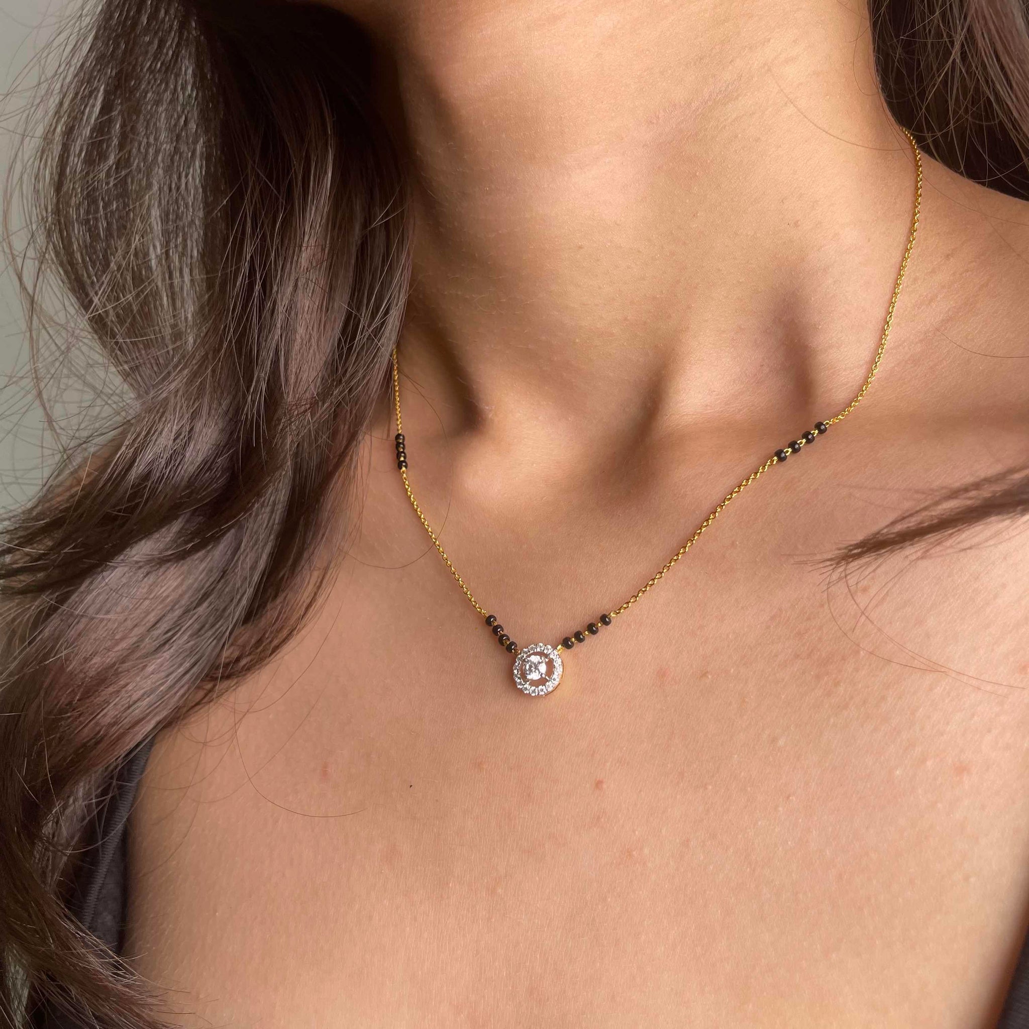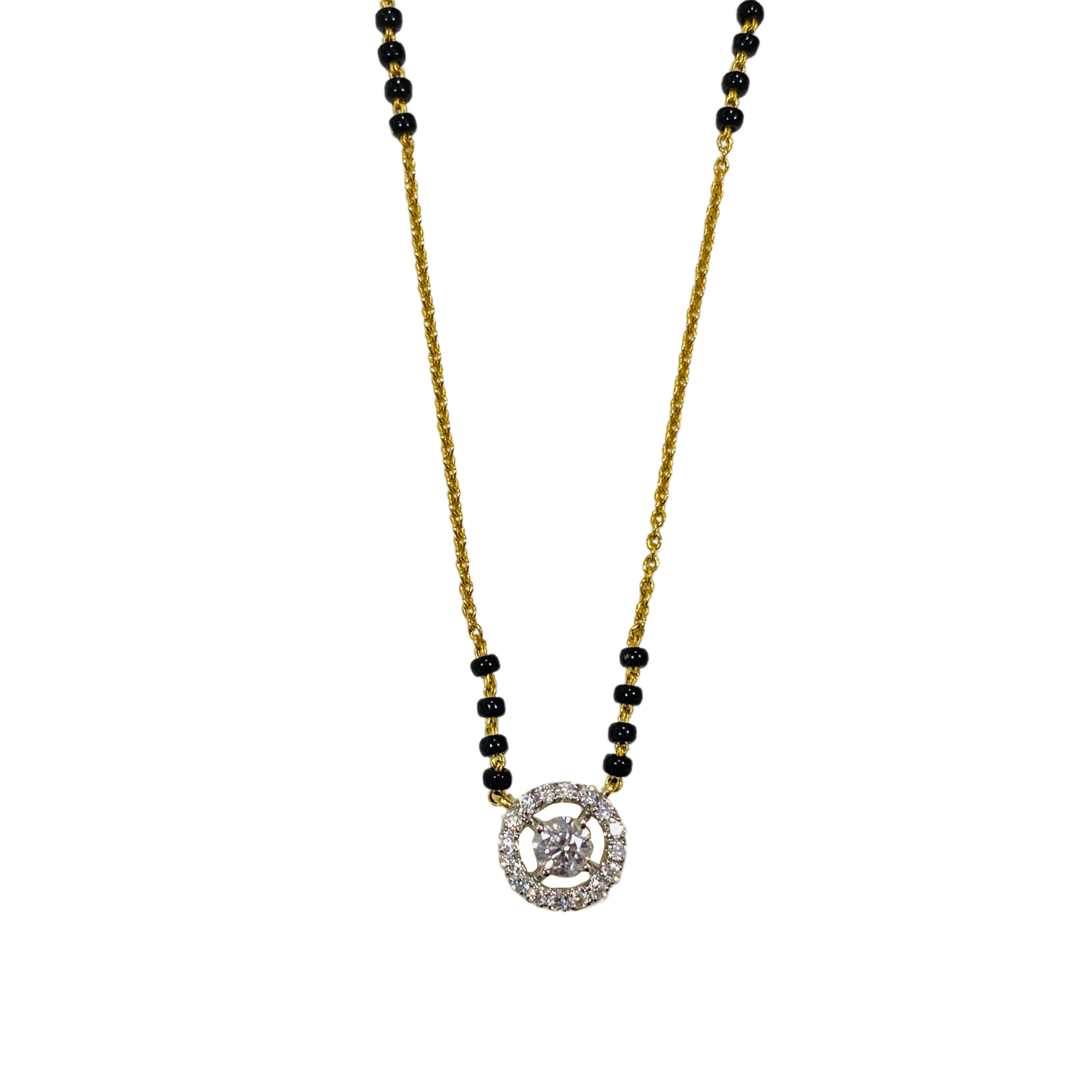 Discover the charm of this exquisite mangalsutra, a stunning piece perfect for your special day or everyday elegance. It features a dazzling diamond circle with a brilliant center diamond, beautifully complemented by a delicate gold chain adorned with traditional black beads. This sophisticated necklace effortlessly blends timeless tradition with modern sparkle, making it a cherished addition to any jewelry collection. Wear it and feel radiant, celebrating your unique style with every graceful movement.